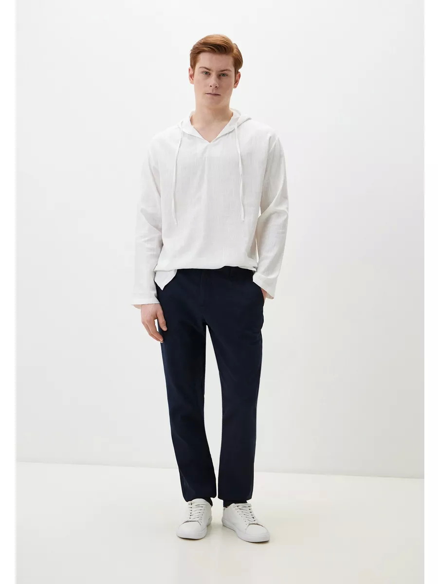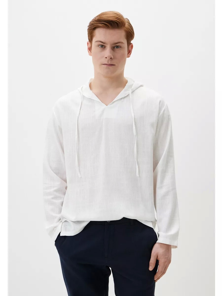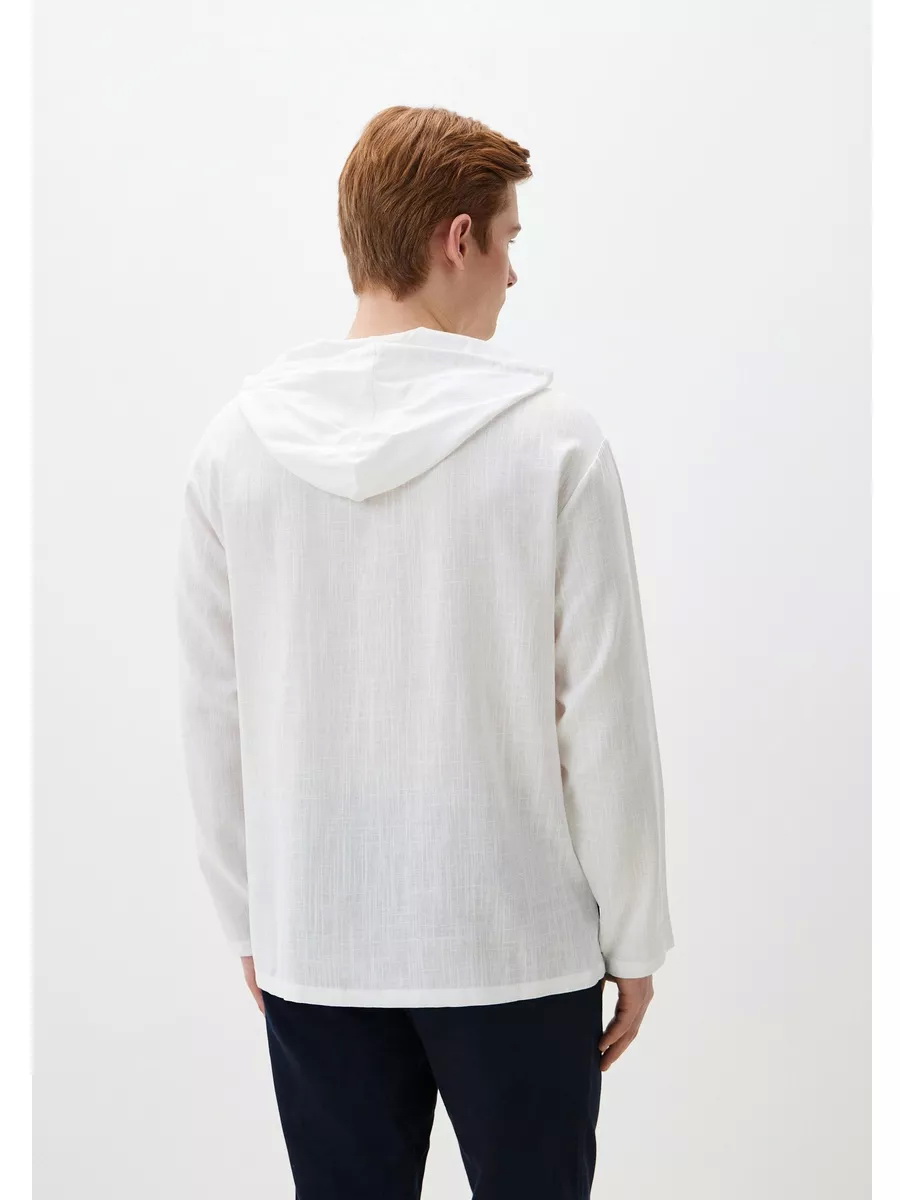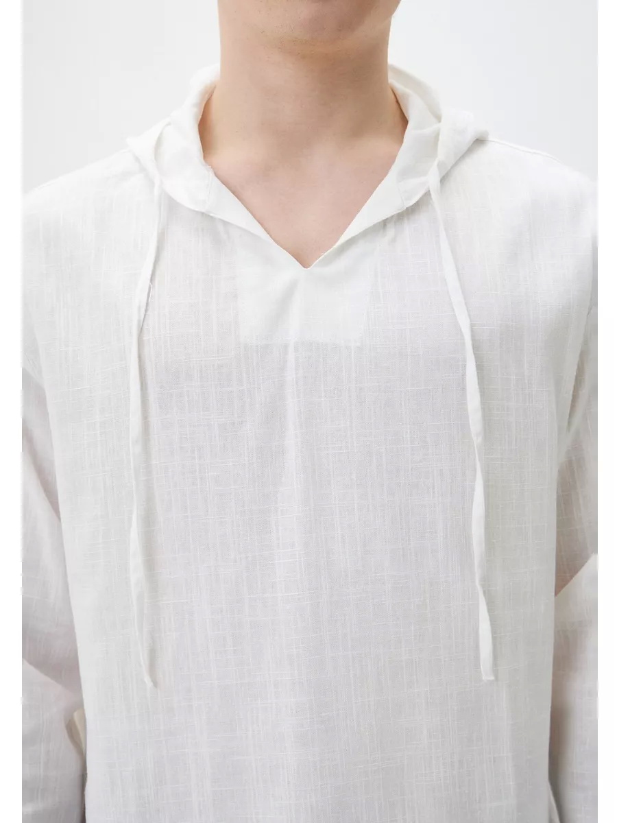 Современная мужская летняя сорочка с капюшоном из гладкокрашеной хлопчатобумажной ткани. Сорочка с объёмным капюшоном, без застёжки, полуприталенного силуэта, с длинными рукавами. По центру горловины переда сорочки вырез в форме острого угла, обработанный подкройной обтачкой. По отлёту капюшона сорочки обработана кулиска с двумя прорезными петлями по сгибу, в которые продёрнута вытачная из основной ткани завязка. Рукава сорочки длинные, нижние срезы застрочены двойной подгибкой. Низ сорочки фигурный, закруглён к боковым швам, в боковых швах разрезы.