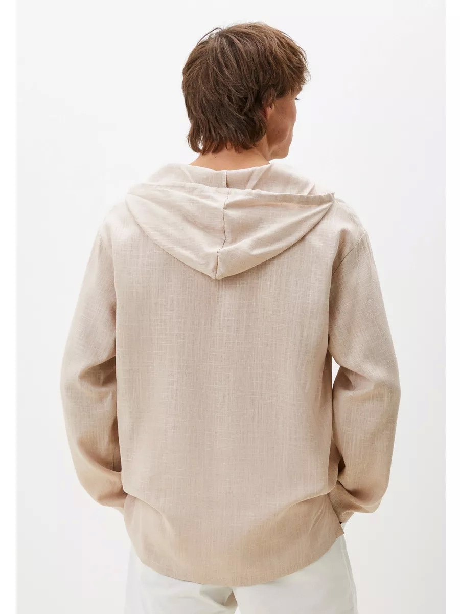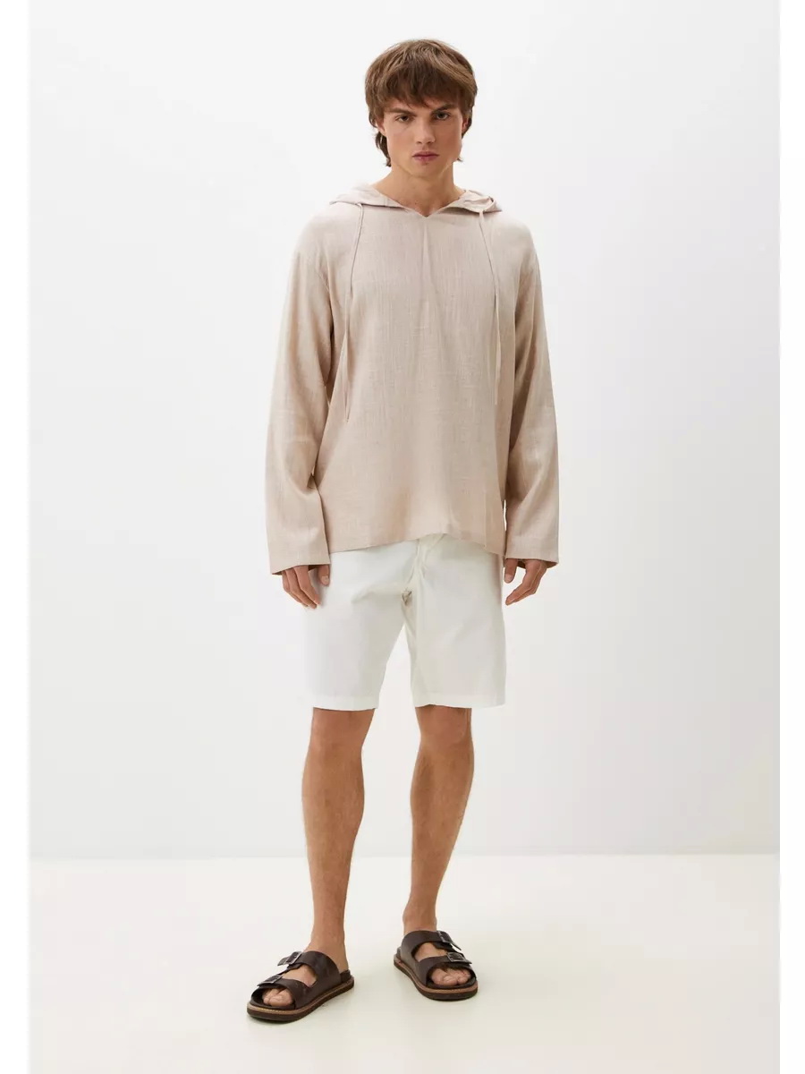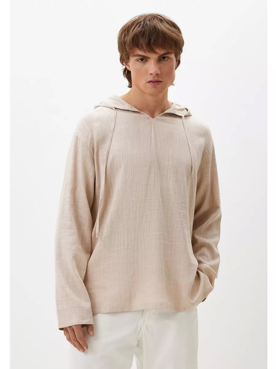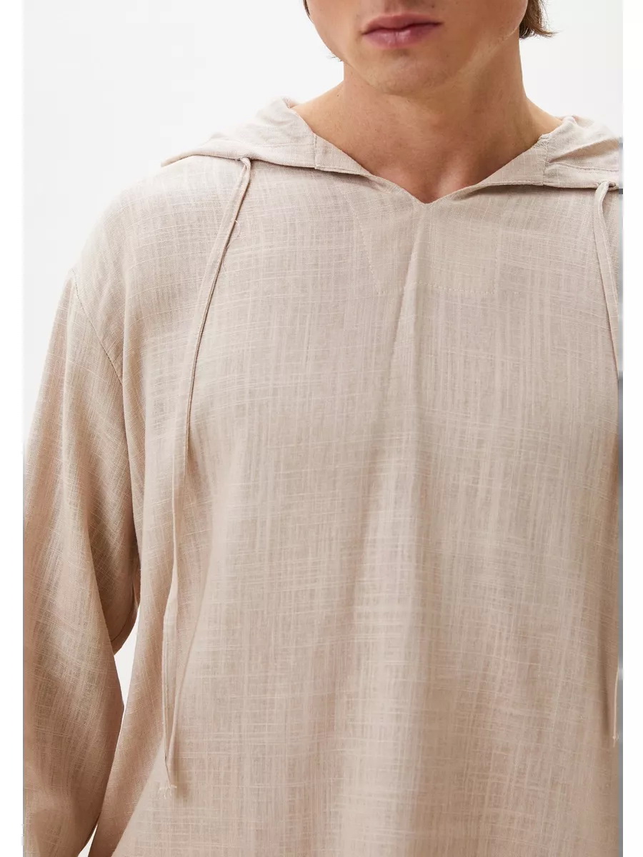 Современная мужская летняя сорочка с капюшоном из гладкокрашеной хлопчатобумажной ткани. Сорочка с объёмным капюшоном, без застёжки, полуприталенного силуэта, с длинными рукавами. По центру горловины переда сорочки вырез в форме острого угла, обработанный подкройной обтачкой. По отлёту капюшона сорочки обработана кулиска с двумя прорезными петлями по сгибу, в которые продёрнута вытачная из основной ткани завязка. Рукава сорочки длинные, нижние срезы застрочены двойной подгибкой. Низ сорочки фигурный, закруглён к боковым швам, в боковых швах разрезы.